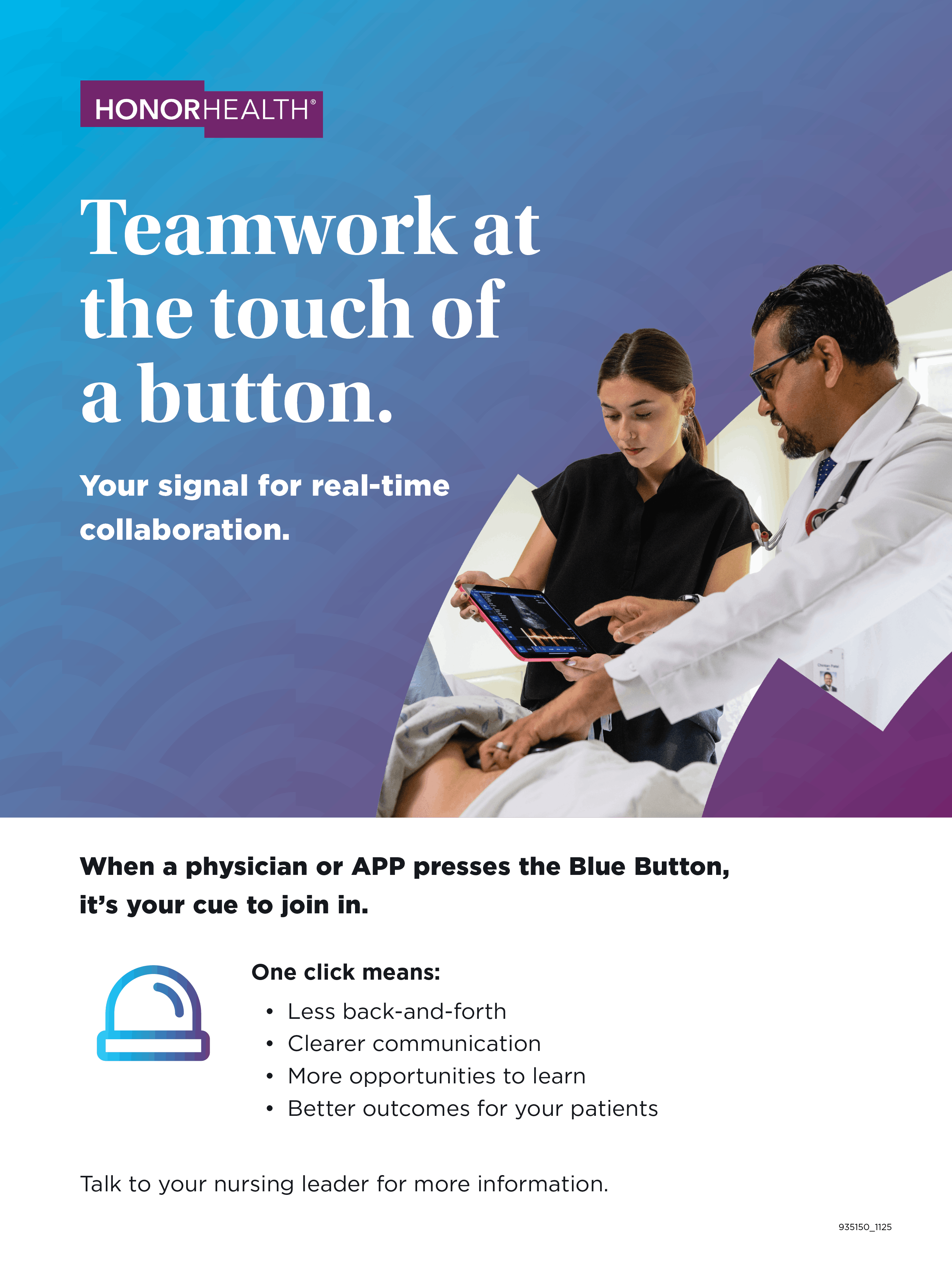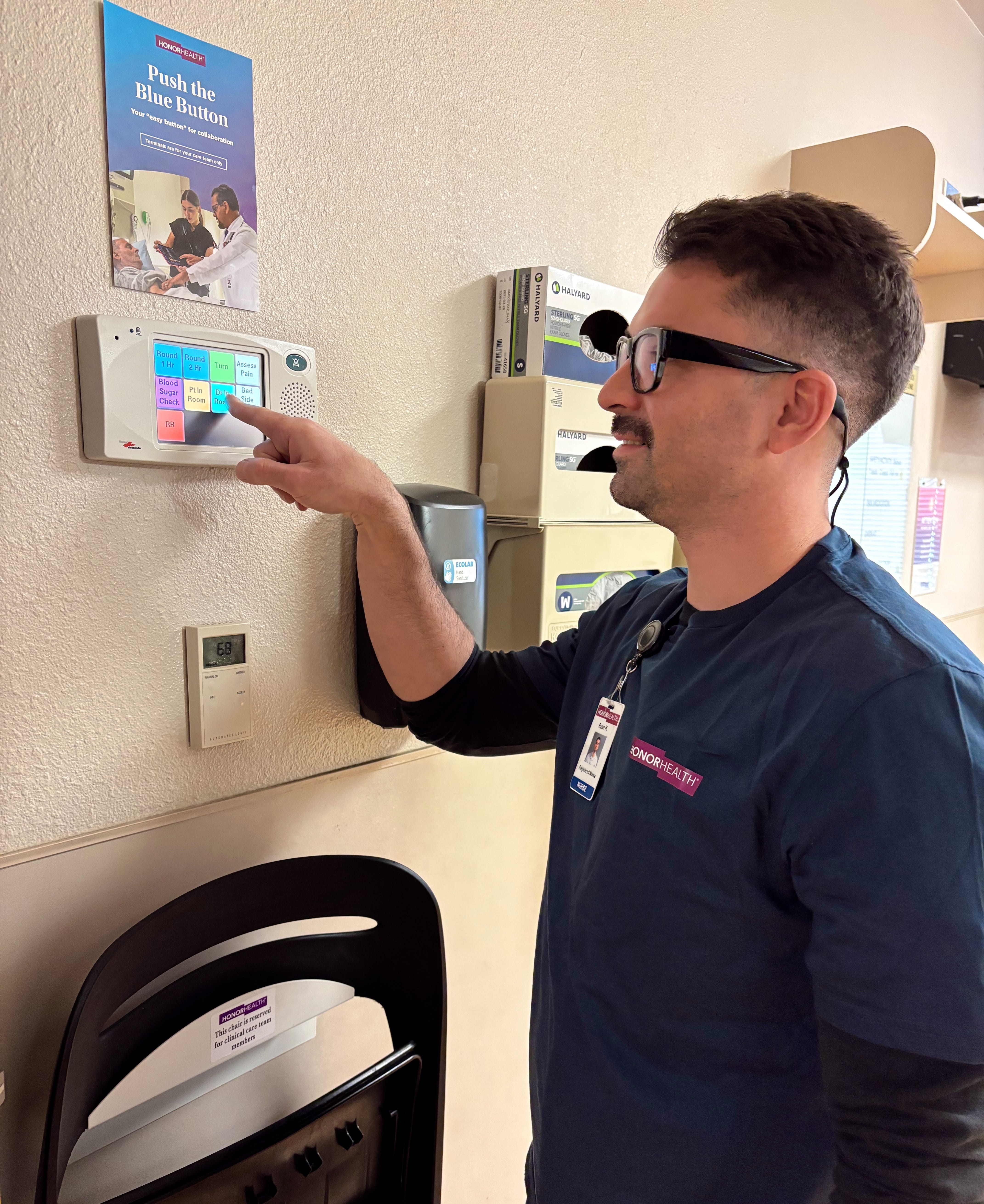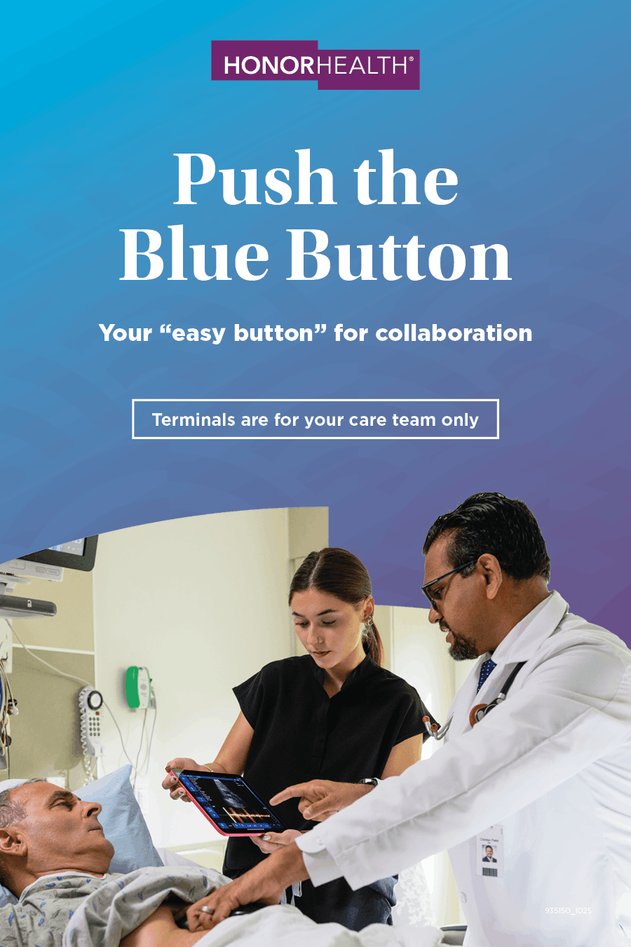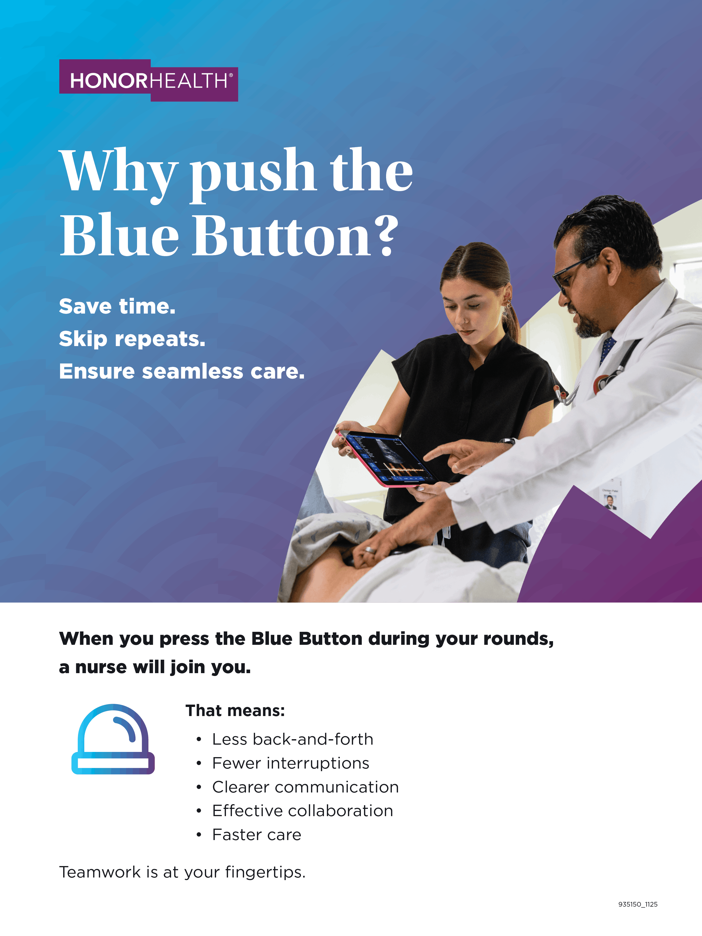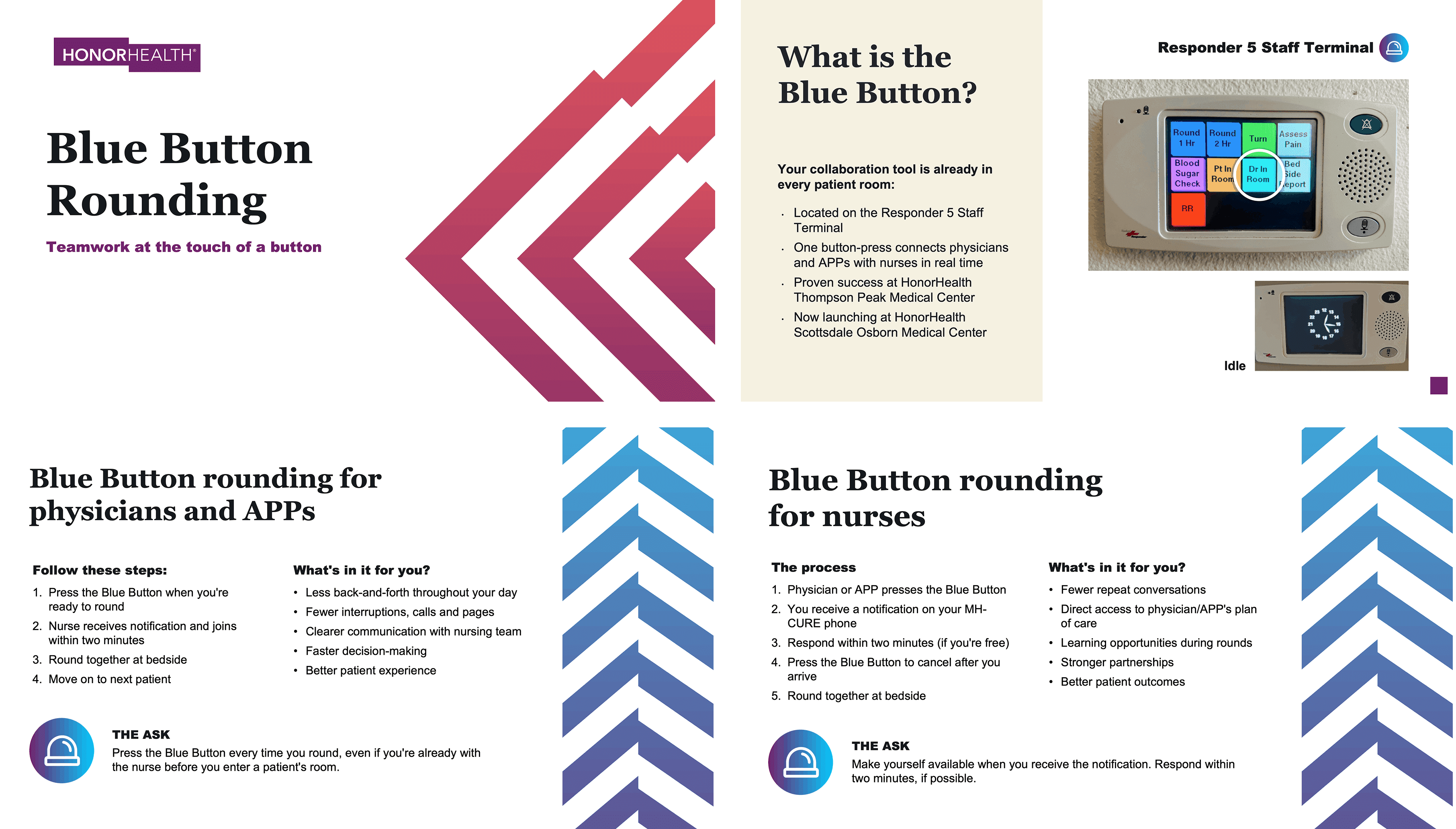 Blue Button Rounding is a collaborative initiative at HonorHealth. When a physician enters a patient room, they press a blue button on the Responder 5 terminal to signal the nurse to join within two minutes.