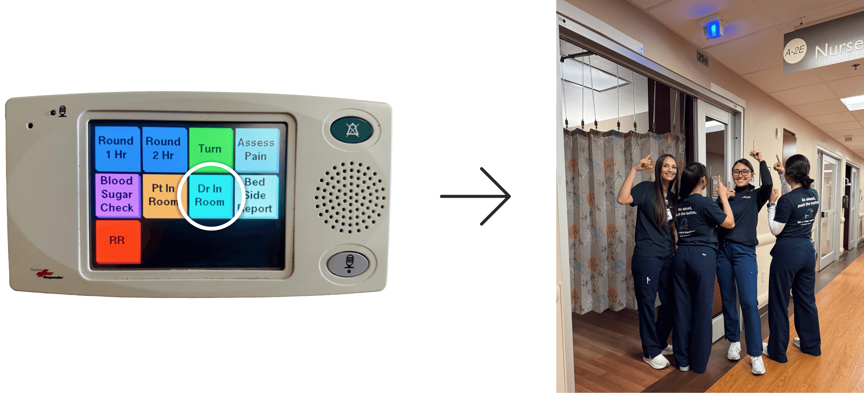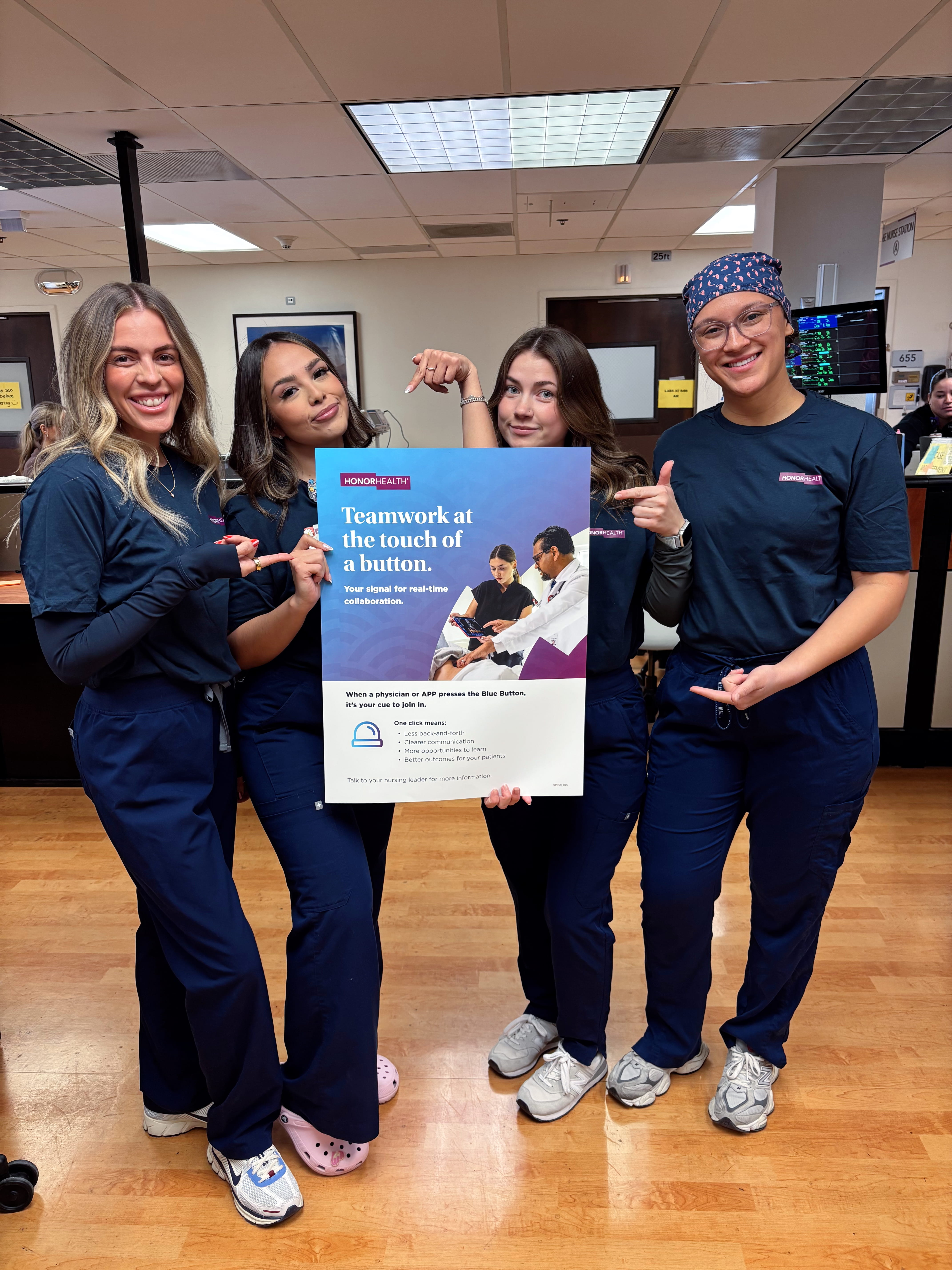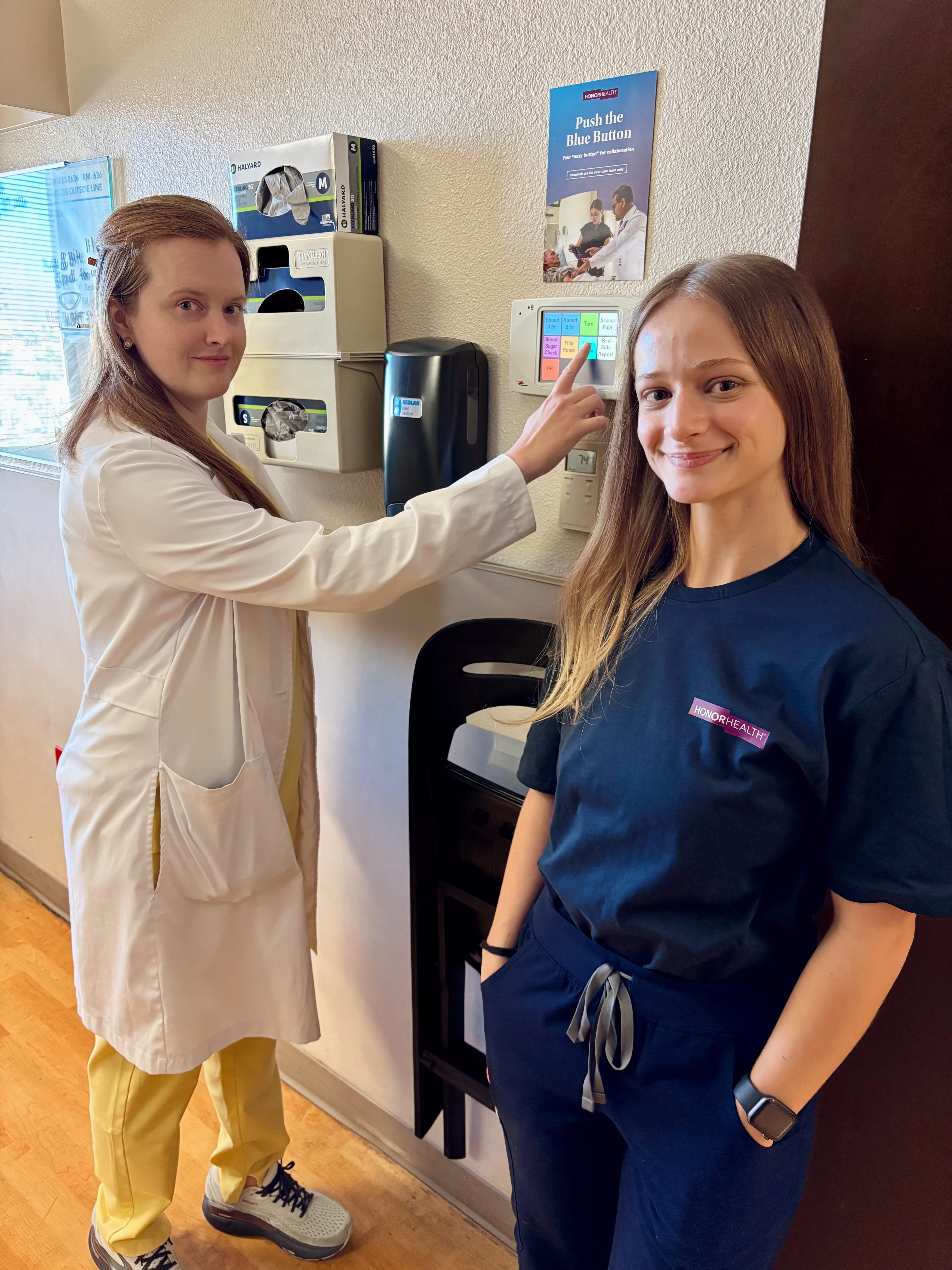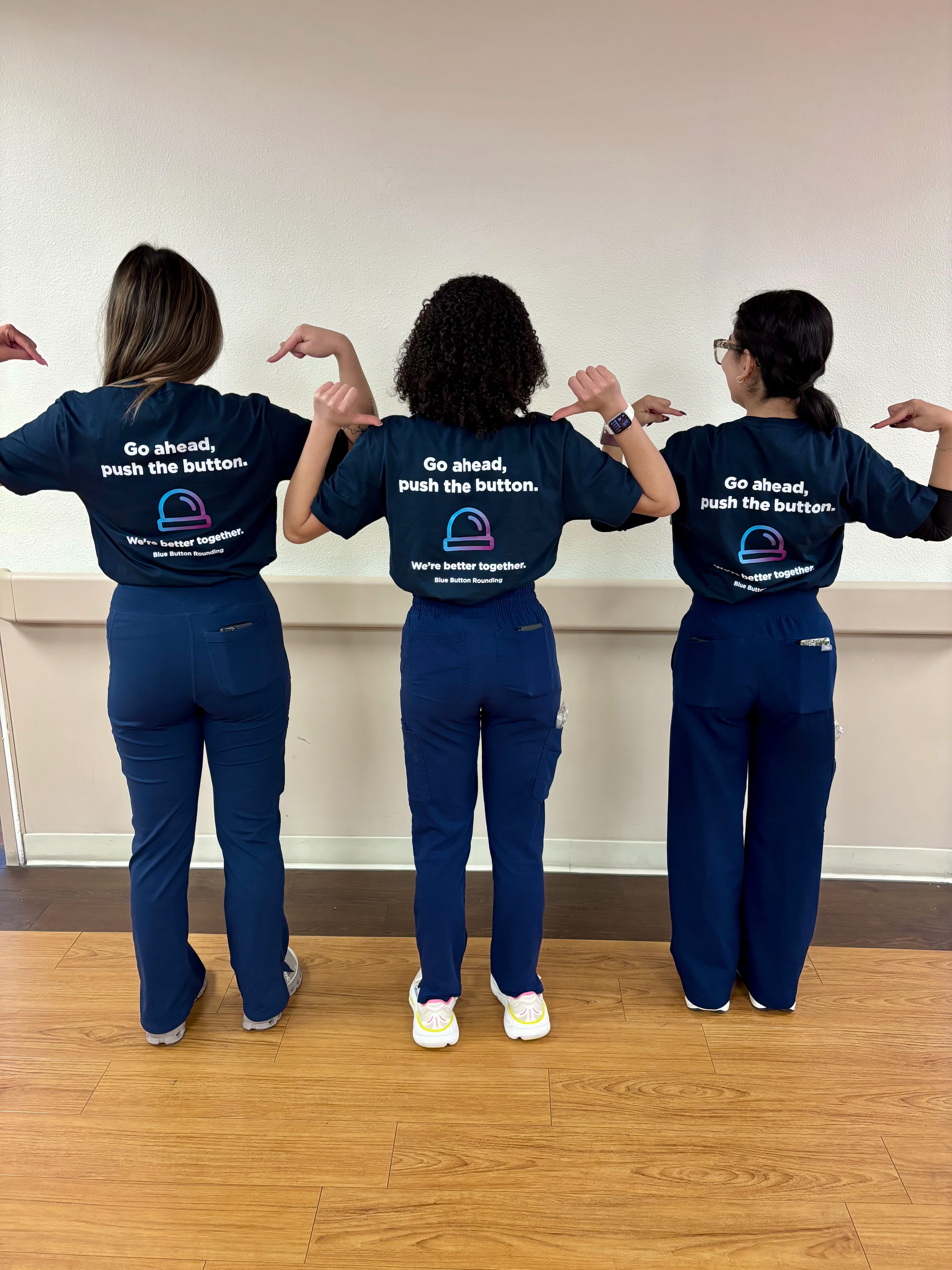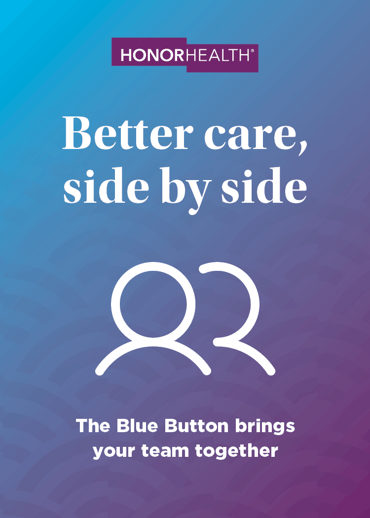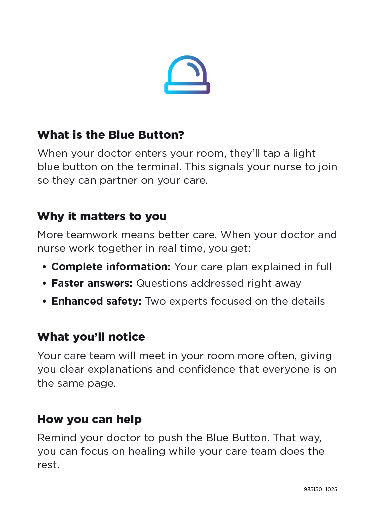 Blue Button Rounding is a collaborative initiative at HonorHealth. When a physician enters a patient room, they press a blue button on the Responder 5 terminal to signal the nurse to join within two minutes.