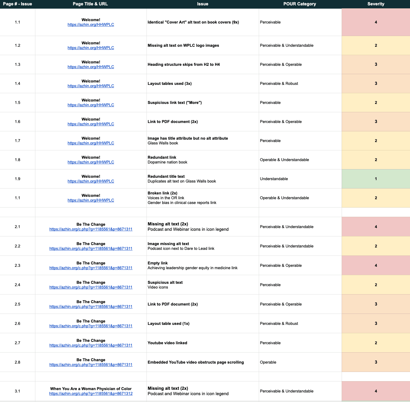 The primary issues included missing or inadequate alt text, inconsistent heading structure, and missing warnings for PDF links that open in new windows.