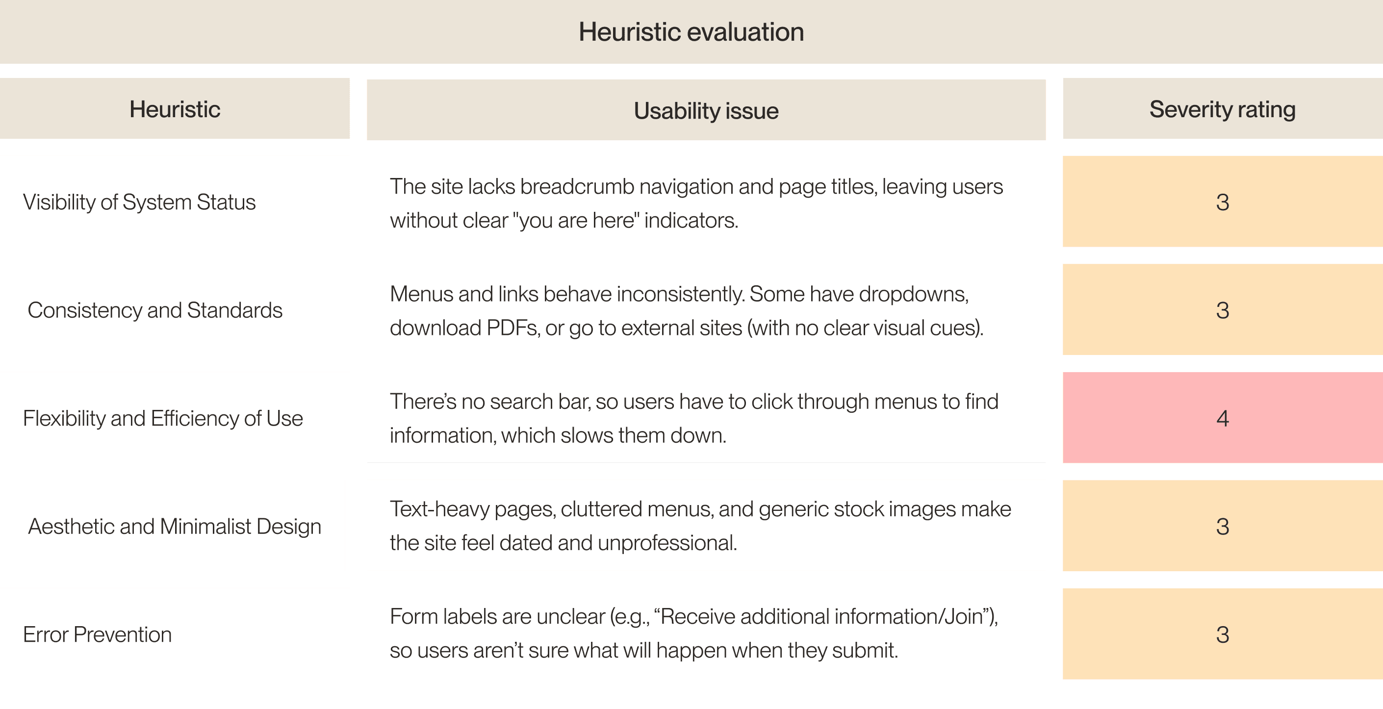 I analyzed the site against Jakob Nielsen's 10 Usability Heuristics using Nielsen’s Severity Scale. This helped me catch the more obvious early and it gave me a helpful checklist to start.