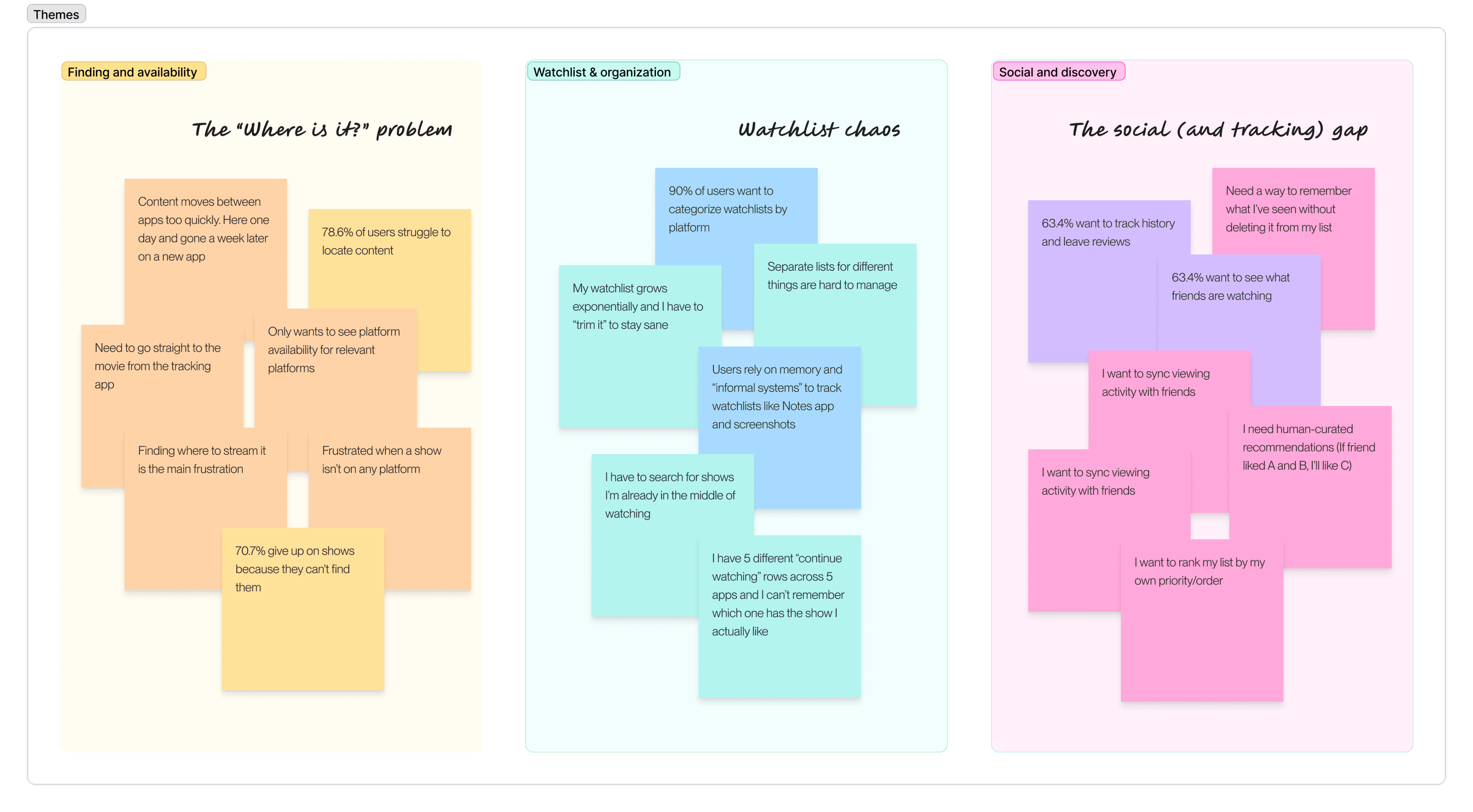 Users relied on screenshots, notes apps, and mental bookmarks. 90% of users found watchlist categorization by platform valuable.