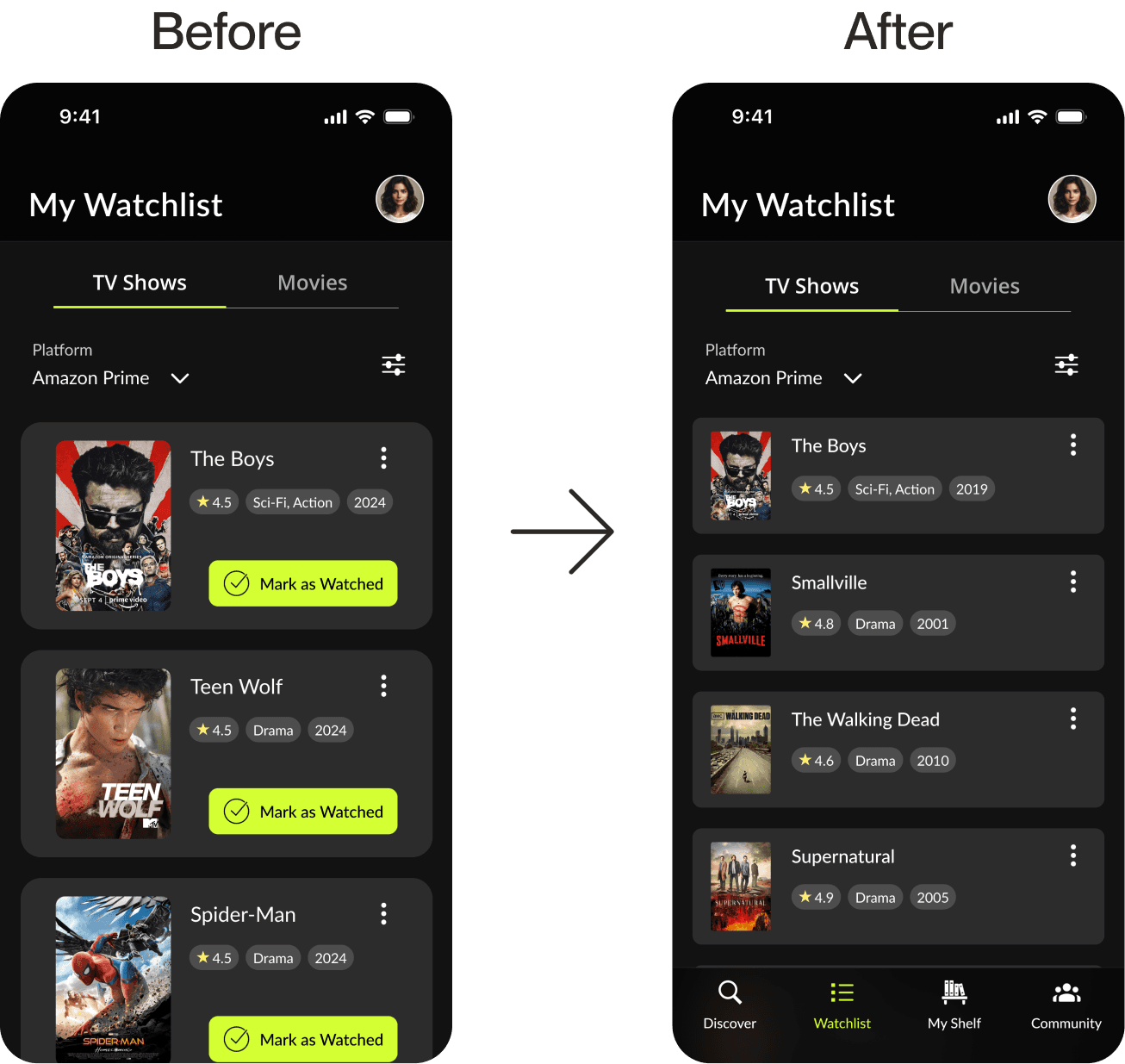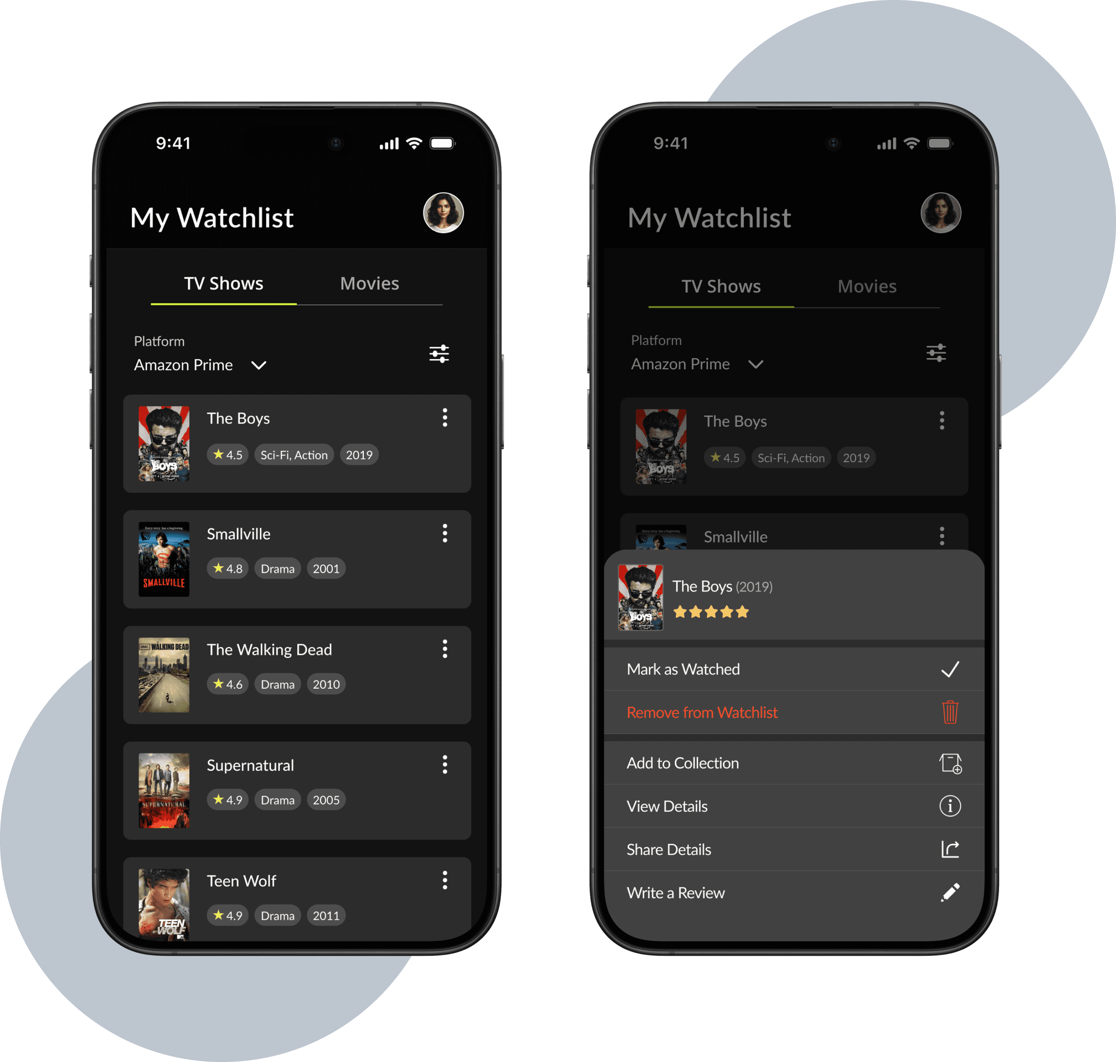 The watchlist features platform filtering and separates Movies and TV shows into tabs, transforming a messy task list into an efficient viewing pipeline.