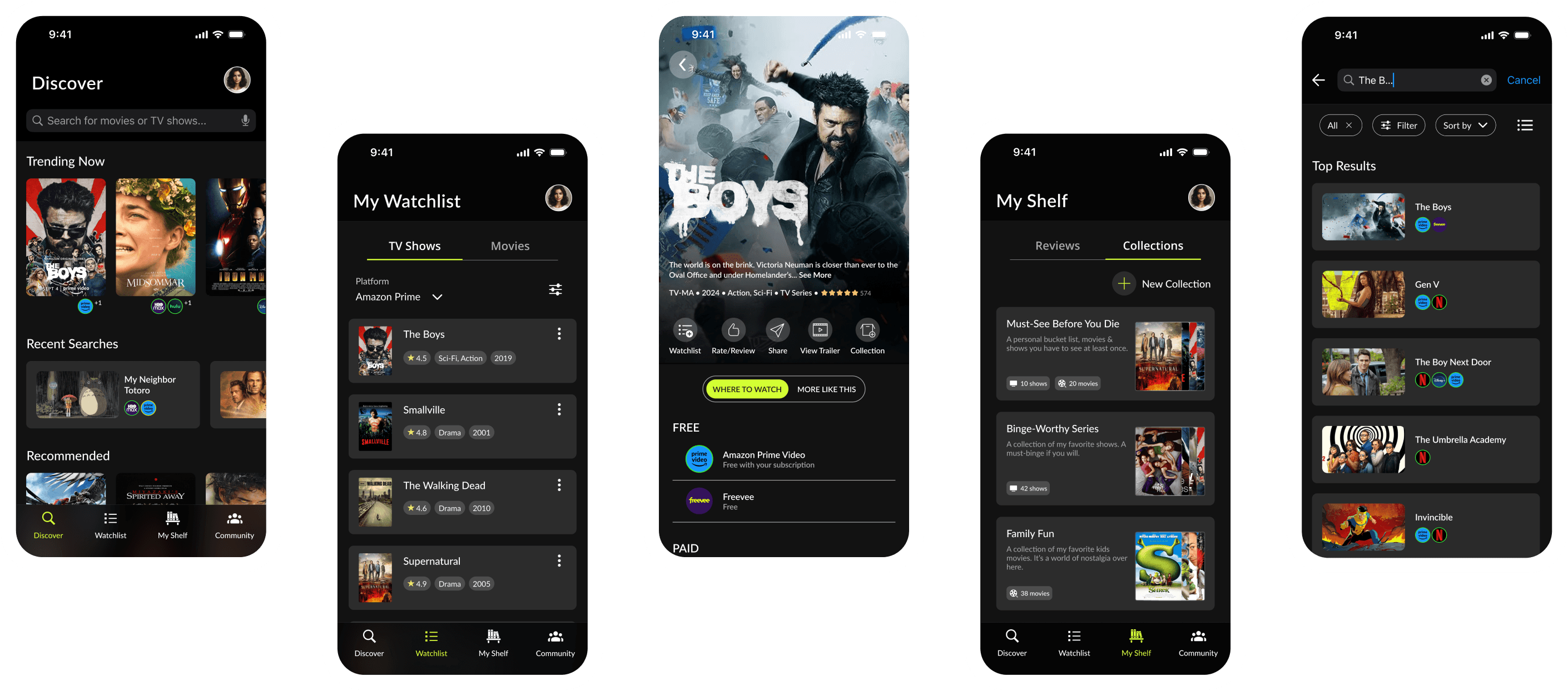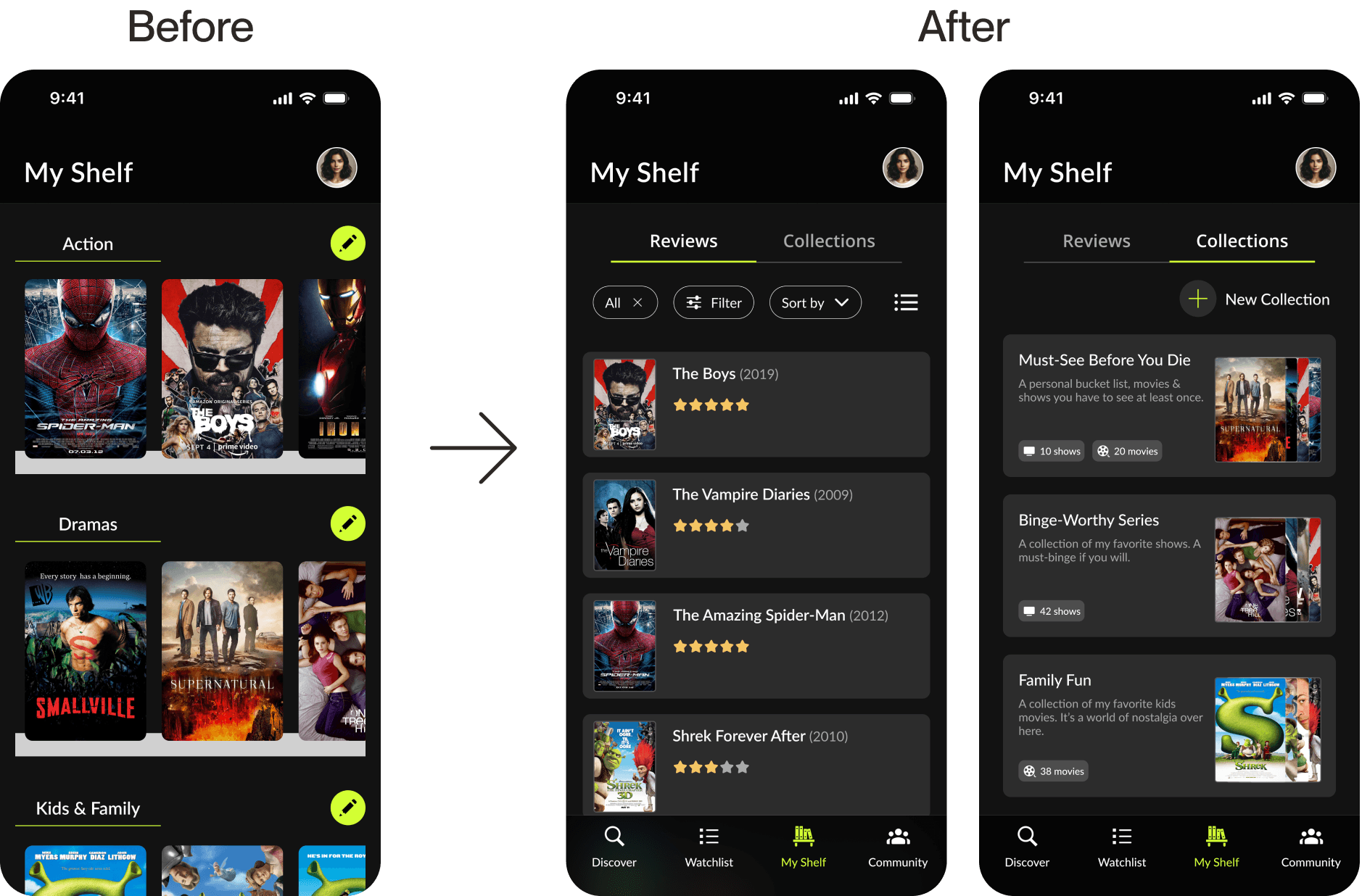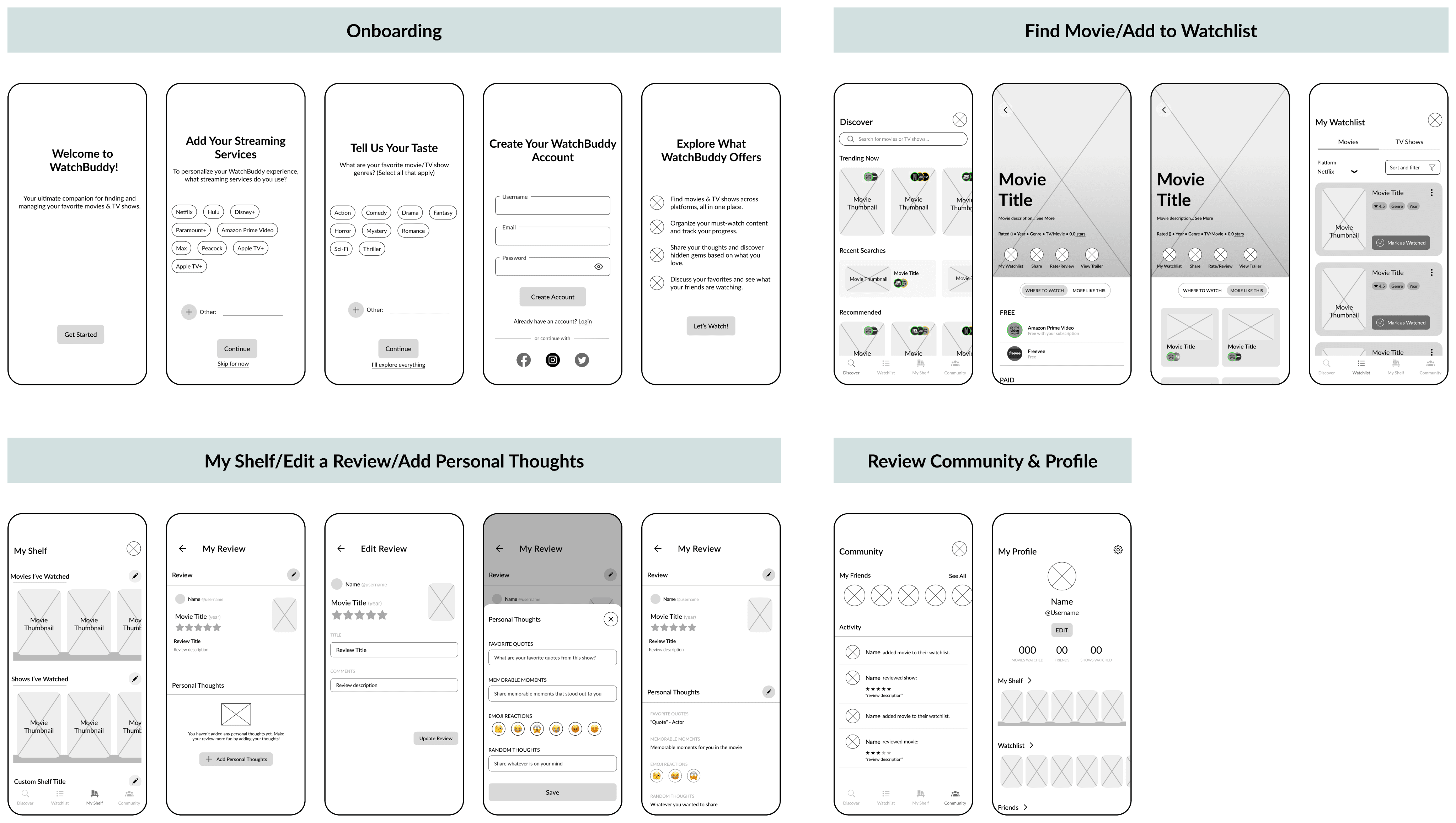 I conducted usability testing with six participants, testing four key flows: Onboarding, finding a moving and adding it to watchlist, navigating “My Shelf” (including editing a review and adding personal thoughts), and interacting with community and their profile.