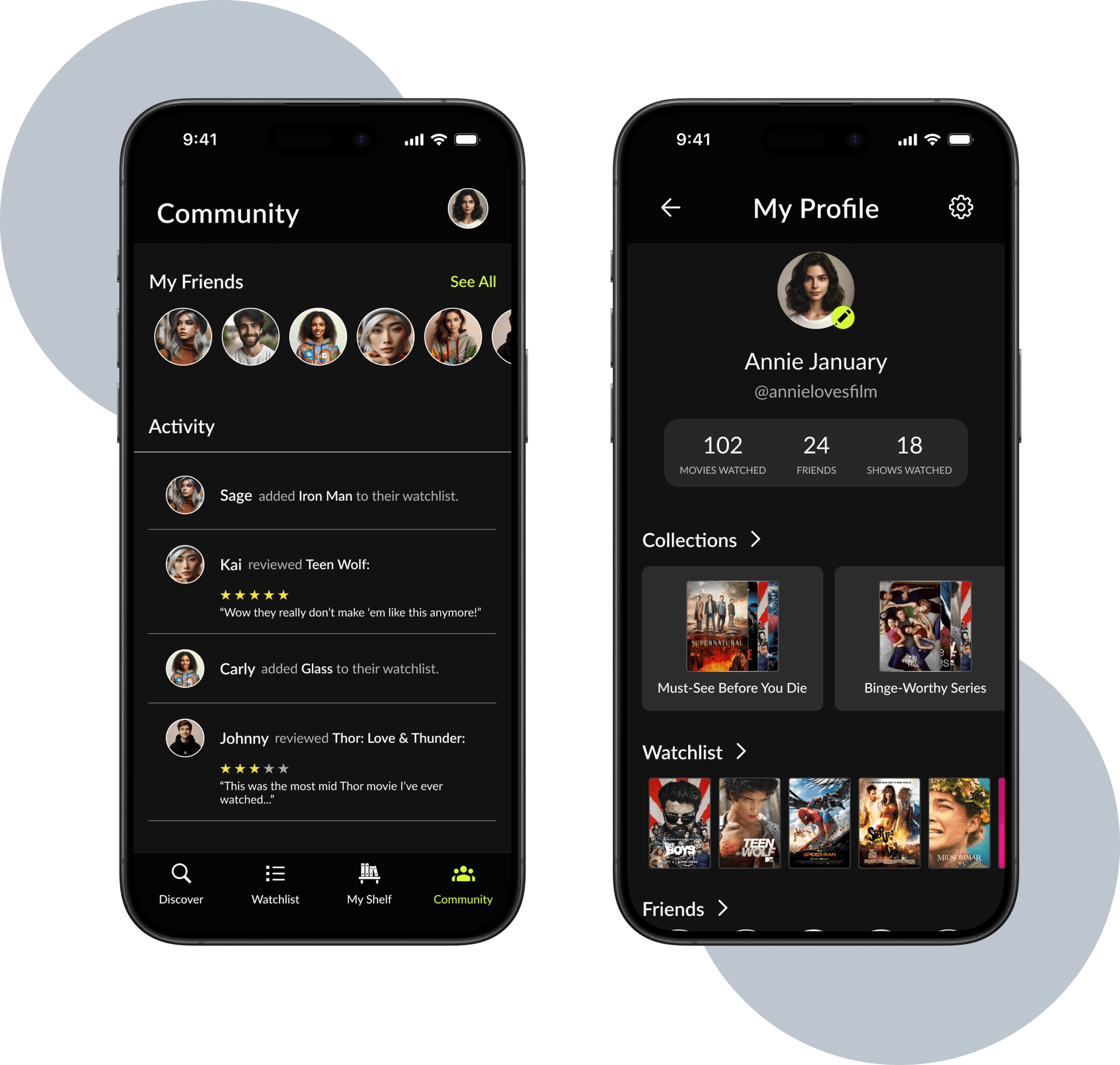 Community shows real-time friend activity: watchlist adds, reviews, and ratings.